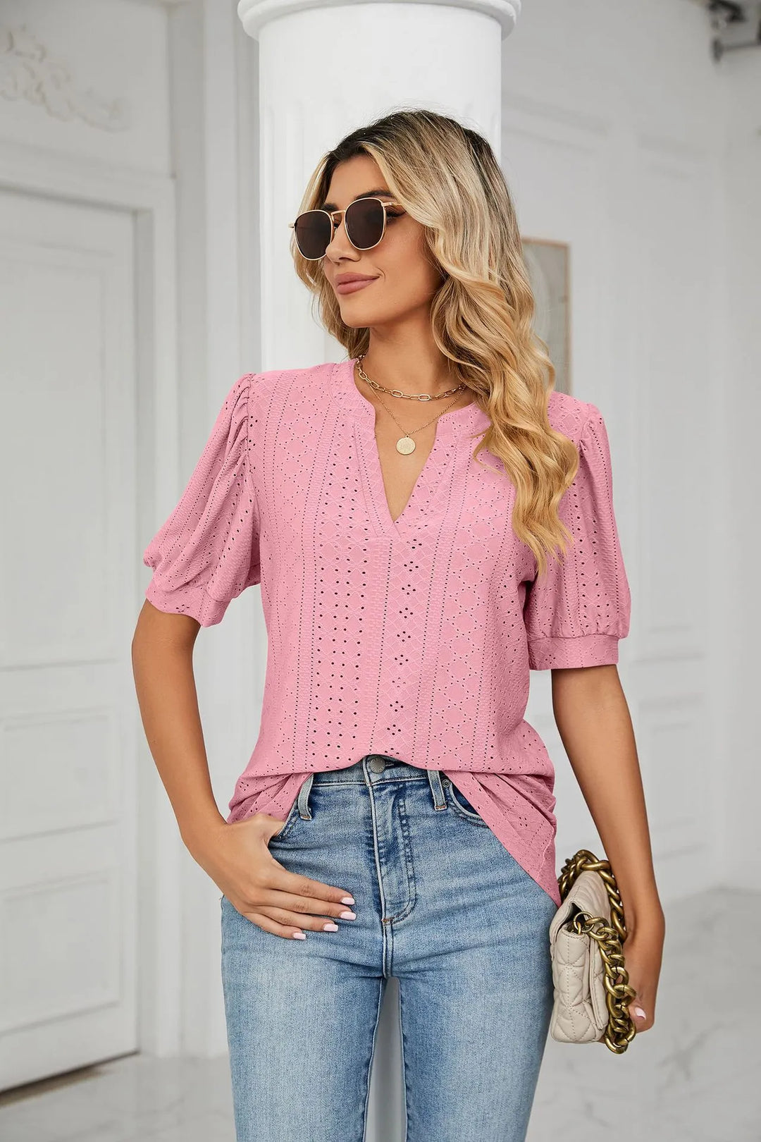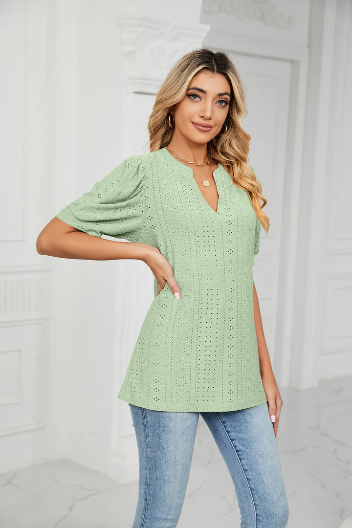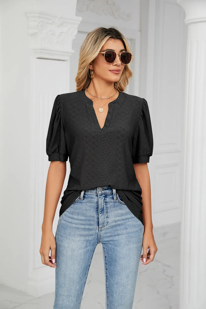 V neck t shirt with puff long sleeves, lace trim, loose fit, solid color, Unique Pointelle Eyelet Design is super cute, makes you flattering in this autumn and winter